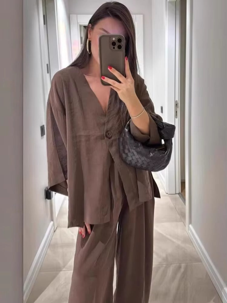 Disponibile in Marrone, Albicocca, Grigio e Nero , questo completo si adatta perfettamente a ogni momento della tua giornata: dall'ufficio all'aperitivo, dalla valigia delle vacanze ai pomeriggi in città. Abbinalo a sandali, sneakers o mules: è versatile, raffinato e sorprendentemente comodo . Non è solo moda, è uno stile di vita.